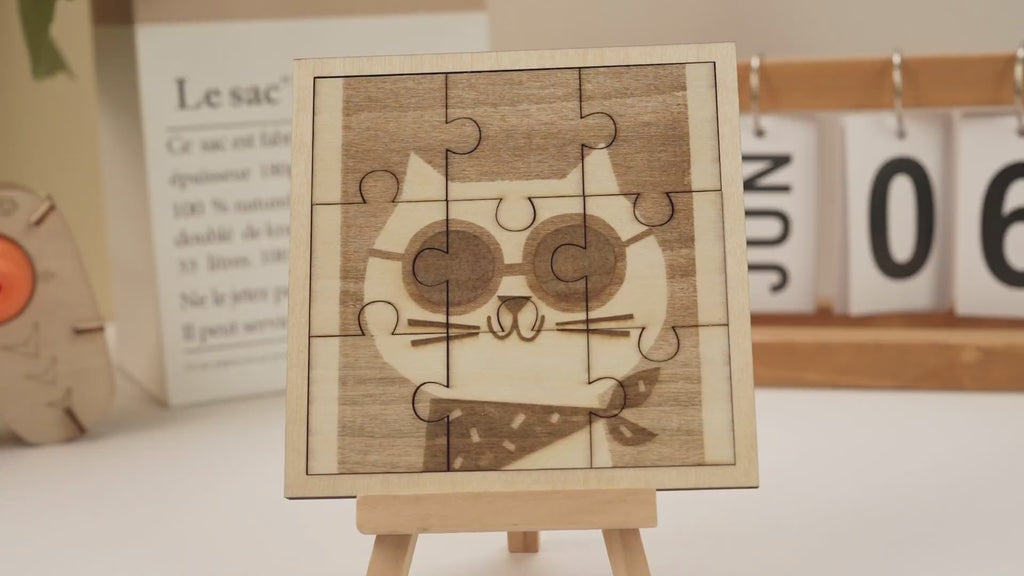 Good question. Engraving burns the image onto the surface of the puzzle, while cutting slices the jigsaw shapes all the way through the material. We engrave the cat image first, then cut the puzzle lines afterward.